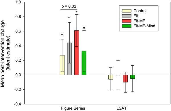The Fit-MF group (cognitive training + exercise) also scored better than the Control group on a number of other tests of fluid intelligence — not just the ‘Figure Series’ test (see Table 1).