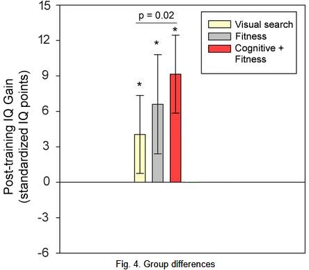 Visual search training (simple perception exercises) saw a 4 point post-training IQ gain. Fitness training saw a 7 point IQ gain. Cognitive and fitness training (combined) saw a >9 point IQ gain.The training gains were in visuospatial fluid intelligence. No groups improved in verbal IQ. This is an important finding, helping to explain some of the null results in previous studies.