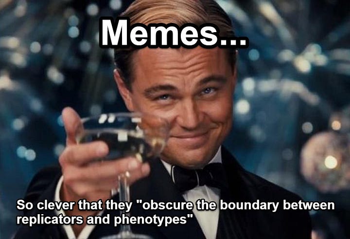 Many contemporary scientists have suggested that our ability to learn from others permits a second system of inheritance, referred to as memes. This proposition, if correct, may obscure the boundary between replicators and phenotypes.
