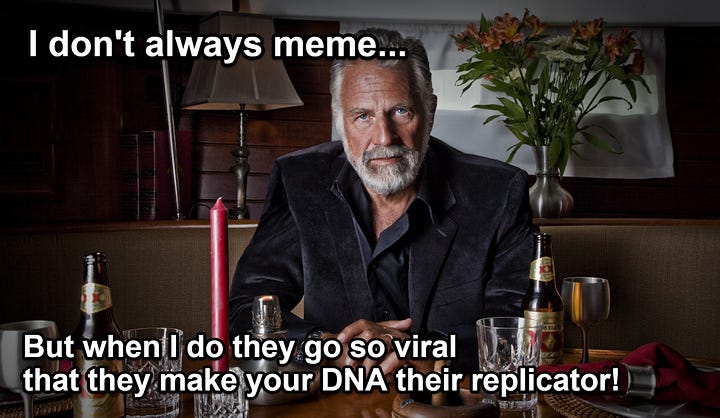 By memes we don't necessarily mean the funny images that get shared around on social media, we mean ideas that take on a life of their own; socialism, capitalism, Christianity, and Islam are some of the most successful memes in recorded history. These are idea viruses and it's hard to deny that don't act a lot like living organisms. They spread, compete with each other for limited resources, and adapt to become more fit. Looking at history you can clearly see how memes use humans to spread and thrive. On their own, they don't do much of anything, but in the minds of men, heartless Darwinian competition ensues.